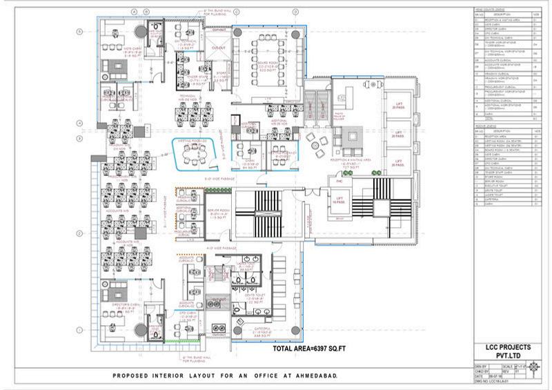 Proposed interior layout for an office in Ahmedabad includes reception, meeting cabins, staff areas, cabins, cafeteria, and toilets. The design balances functionality and aesthetics, offering spaces for formal and informal meetings, private work, collaboration, and relaxation. The layout aims to enhance efficiency, encourage collaboration, and create a modern and welcoming workspace in Ahmedabad.