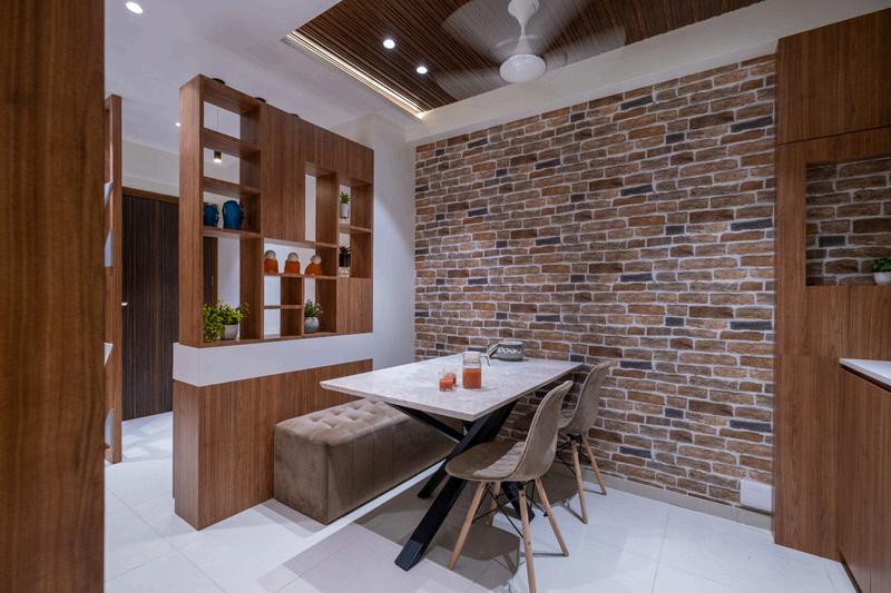 Incorporating elements such as fluted panels, PU laminations, and wooden flooring adds a touch of luxury and warmth to the overall design. The fluted panels bring texture and depth to the space, while the PU laminations provide a sleek and polished finish. The wooden flooring adds a timeless charm and complements the overall aesthetic of the apartment.