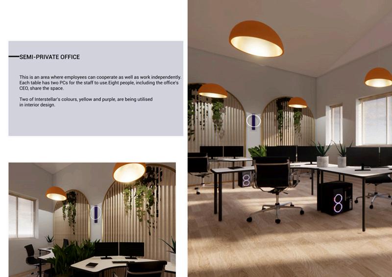 A compact office space was designed for Standard Chartered Bank, optimizing materials for an open layout in a limited space for 21 employees. The workspace integrates functionality, aesthetics, and productivity. Each zone serves a specific purpose, with natural light, greenery, and modern furniture creating a welcoming and inspiring environment. Sustainable materials and smart storage maintain organization and calm. The color scheme promotes tranquility and energy. The office reflects thoughtful design, functionality, innovation, collaboration, and productivity.
