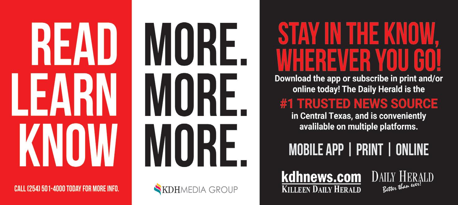 Since its first publication in 1890, the Herald has evolved into an awardwinning multimedia company that is recognized as a vital resource across the Central Texas region. The awardwinning media company offers a variety of products across a full range of platforms, from traditional print publications to the Herald’s website, KDHnews.com, as well as social media platforms such as Facebook and X.