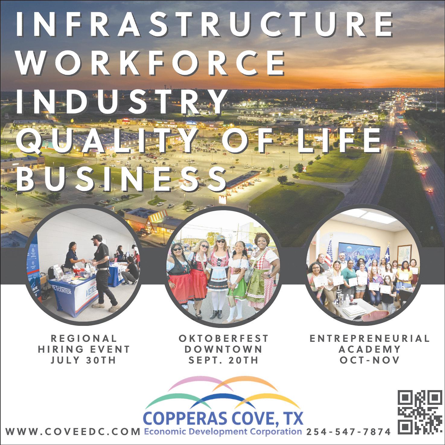 seniors. The expansion of Fire Station #3 is underway to meet the demands of our growing population on the west side of town. Lastly, the Texas Department of Transportation (TxDOT) will be letting, or bidding, the installation of access ramps on State Highway 9 at Old Georgetown Road and Tank Destroyer Road, the U-turn signal at E Business US 190 and Constitution Drive, and the US Highway 190 Bypass Expansion, which includes two new lanes, multiple bridges—including a new 4lane bridge at FM 2657—and improved connectivity to I-14 on the west side of the city. The projects will help expand our economic development efforts in collaboration with the Copperas Cove Economic Development Corporation. Community engagement remains a top priority. Programs like youth sports, Keep Copperas Cove Beautiful, library reading camps, and Christmas in Cove are made possible through your participation. The Copperas Cove Citizens Leadership Academy will launch again in August 2025 to empower residents with hands-on learning about local government.