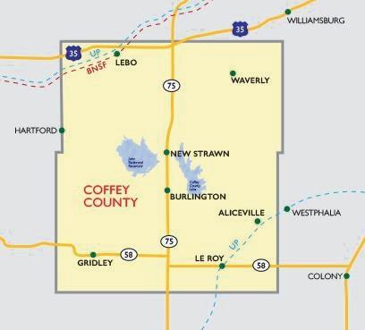 Excellent fishing and recreation sites in Coffey County include: Lebo, New Strawn and Gridley City Lakes, Neosho River, Coffey County Lake, John Redmond Reservoir, Wolf Creek Environmental Education Area, and Flint Hills National Wildlife Refuge.