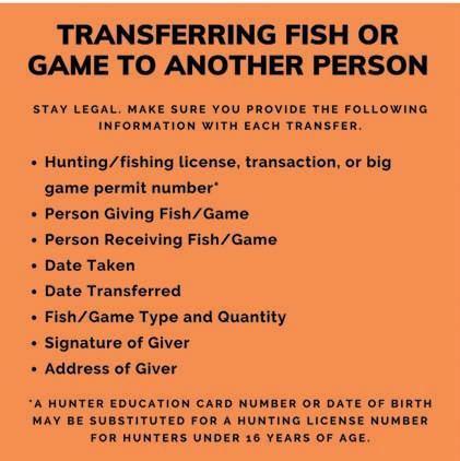 Game given to another person must be accompanied by the donor's name, address, license, transaction or permit number, and signature, as well as the date of donation. Contact KDWP for suggested donation form.