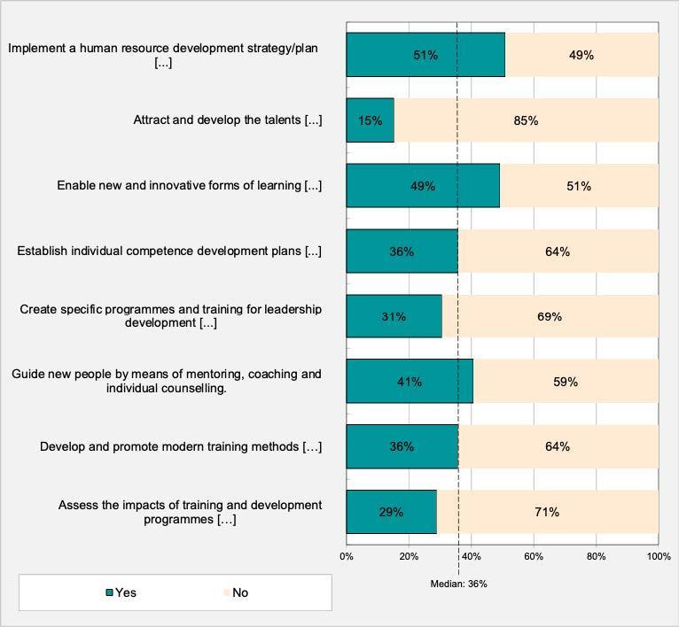 Das interne Schulungsprogramm wurde stärker auf die von den Mitarbeitern, der Unternehmensführung und dem Unternehmen benötigten Kompetenzen ausgerichtet. Es wurden innovative Schulungsund Lernmethoden (Webinare, Blended Learning usw.) entwickelt. Programme zur Fortbildung von Führungskräften wurden verbessert (z. B. spezielle Schulungsprogramme, Einarbeitung usw.). Es wurden Maßnahmen zur Bewertung, Entwicklung und Förderung der Mitarbeiterleistung eingeführt (z. B. Leistungsdialoge, Belohnungssystem usw.). Das Wissensmanagement wurde verbessert (z. B. Entwicklung einer internen Wissensdatenbank, Suchfunktionen und Auffindbarkeit von Informationen usw.). Es wurde eine Datenbank für Kompetenzen und Fähigkeiten eingerichtet.Die Mitarbeiter wurden ermutigt, ihre Innovationsfähigkeiten (z. B. Agilität, Design Thinking usw.) zu verbessern. Es wurde ein Programm zur Verbesserung der digitalen Kompetenz entwickelt. Die Mitarbeiter wurden rechtzeitig/im Voraus über die Einführung neuer Verfahren oder Projekte informiert.