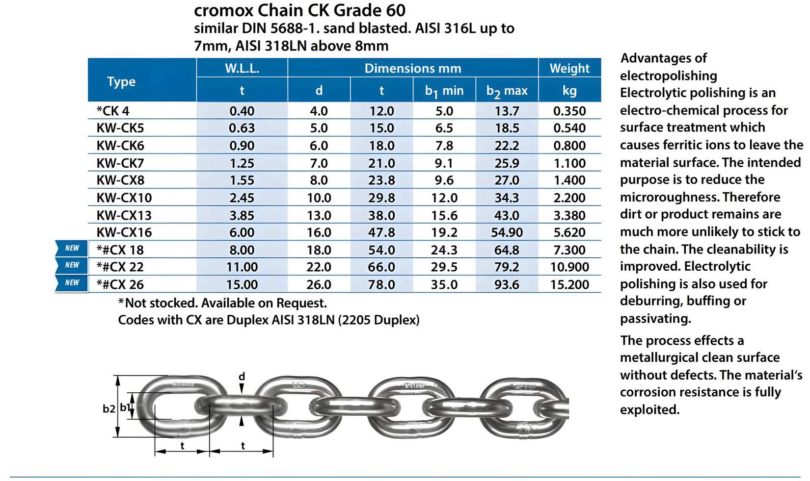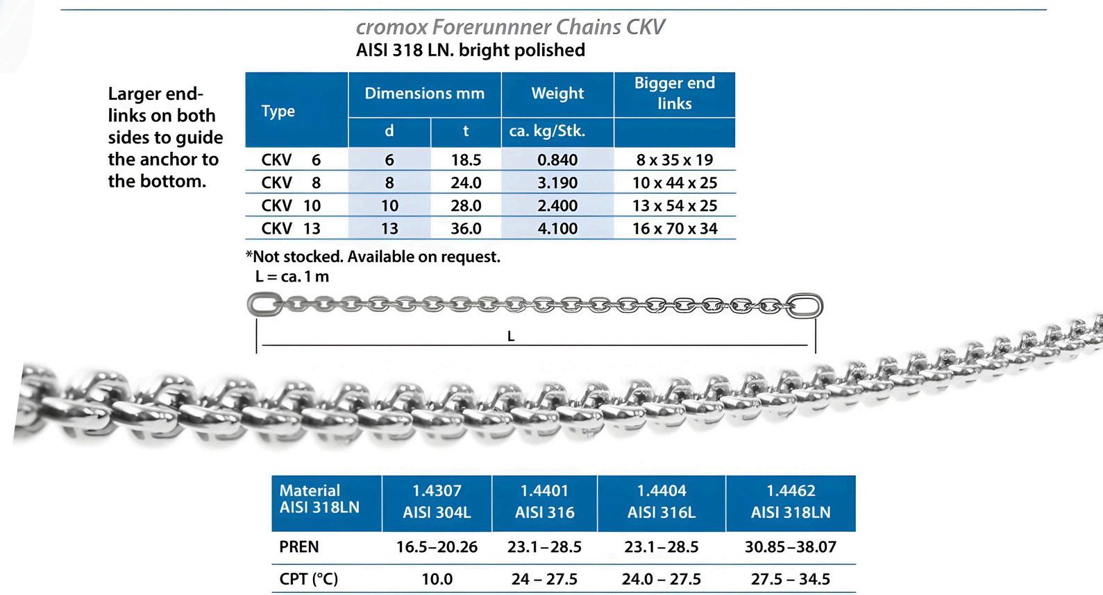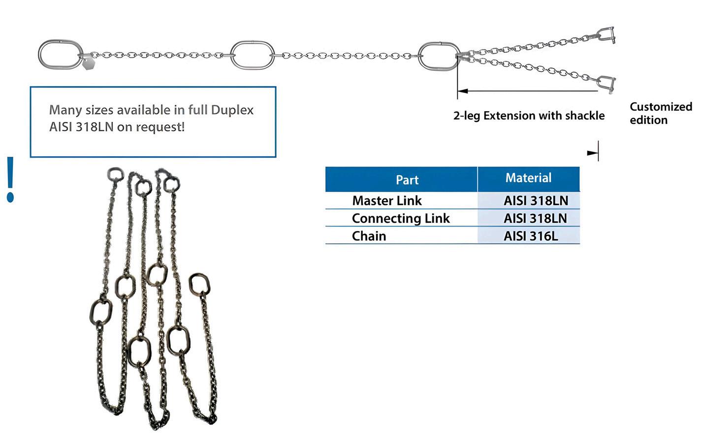 Before raw materials are made into chains and accessories. we carefully select only the best steels that adhere to our strict quality standards. Our products consist of 1.4404 (AISI 316L) (low-magnetic) or of 1.4462 (AISI 318 LN) (magnetic). such as hooks. safety latches. bolts. chains. master links. Safety pins are made of 1.4310 (AISI 302). springs of 1.4571 (AISI 316 TI). identification tags of 1.4301 (AISI 304). ropes of 1.4404 (AISI 316L) and ferrules of 1.4571 (AISI 316 TI). 1.4404 (AISI 316L) and 1.4462 (AISI 318 LN) offer excellent chemical and mechanical advantages.