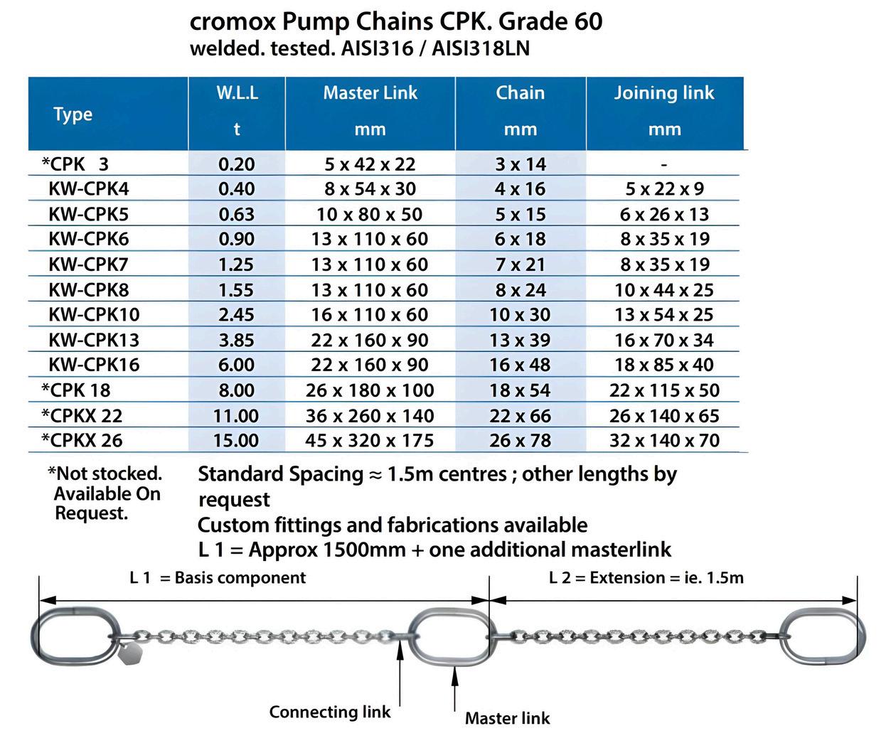 cromox pump chains enable safe lifting and lowering of pumps and aeration devices. Accompanied with WLL-tag and certificate. In addition to our standard sizes we offer customized solutions.
