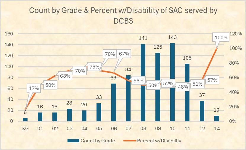 Figure 24: Count by Grade & Percent w/Disability of SAC served by DCBS