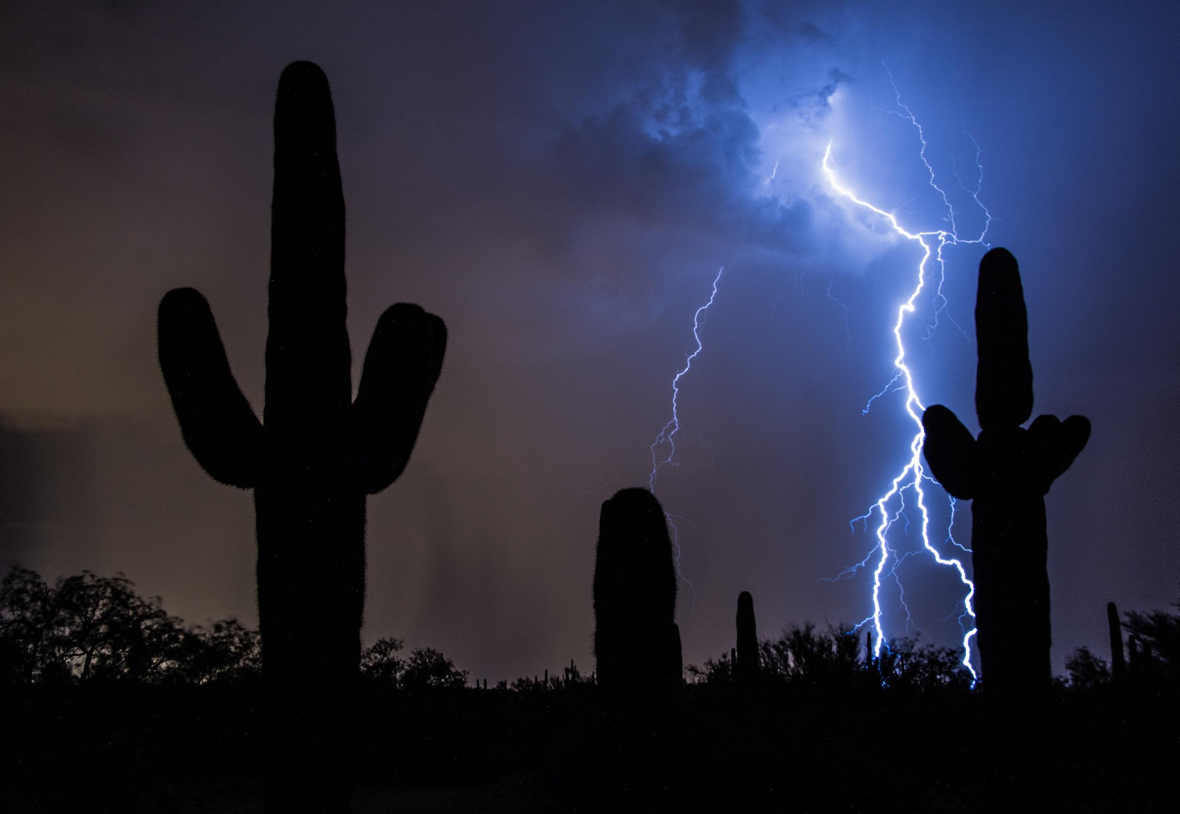 HUMOR Lightning and clouds behind the silhouette of Saguaro cactus, taken during a monsoon storm in Tucson, Arizona in 2016 * Photo: Digital Intuitive