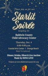 Join us on Thursday, December 4, 2025, for a magical evening at the Coastal Arts Center in Orange Beach—all in support of child abuse victims in Baldwin County. Our third annual Starlit Soiree will be an unforgettable night featuring live music by ISING LIVE, fantastic food, exciting silent and live auctions, and more. Gather your friends and family and be part of this important mission to provide hope and healing to children in crisis. Visit baldwincountycac. networkforgood.com/events/88385-starlitsoiree for more information.