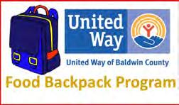 Did you know that several United Way of Baldwin County agencies throughout the county provide backpack programs to area schools? The Backpack Program works with teachers and counselors at public schools throughout the county to identify students who are food insecure and provides those students with easy to prepare snacks and meals to take home on weekends. The food is placed in the child’s backpack each Friday. The child’s information remains anonymous to donors, peers and the food pantry. The average cost is $140 per child per school year. Donations from this fund will go directly to support Backpack Programs in Baldwin County. The United Way of Baldwin County is a nonprofit 501(c)(3) charity. Donations are tax deductible as applicable by law. For more information ot to make a donation visit https:// us.commitchange.com/al/foley/united-way-ofbaldwin-county-inc/campaigns/2024-backpacks.