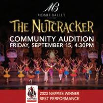 Mobile Ballet is inviting the community to be a part of THE NUTCRACKER, one of Mobile’s favorite holiday traditions for 35 years, and winner of the 2023 Nappie Award for Best Performance of the Year. Auditions will be held September 15, 4:30pm at Mobile Ballet Studio, 4351 Downtowner Loop N, Mobile. It is free to audition and open to the community. Male and female dancers are welcome to audition.