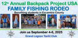 The Annual Backpack Project USA Family Fishing Rodeo benefiting students in Escambia County will be September 4-6, 2025 at Grand Lagoon Yacht Club in Pensacola. Backpack Project USA helps provide food to Escambia County Public Schools students who are at risk for hunger. The Family Fishing Rodeo consists of an Open and Junior Division. The Open Division is for anglers 13 and older, with an entry fee of $25.00. The Junior Division is for anglers 12 and under, with no entry fee. The Open Division offers 1st, 2nd, and 3rd place monetary prizes; while the Junior Division offers prizes such as trophies for the 1st, 2nd and 3rd place finishers. Additionally, all 1st Place winners in each category in the Junior Division will be included in a drawing for a kayak. Please visit https://www.eventbrite.com for more information.