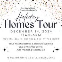 The fourth annual Holiday Homes Tour will take place on Saturday December 14, 2024, and will feature historic homes and places of worship along Government St. The tour will also feature The Kate Shepard House on Monterey Place. Each location will be beautifully decorated for the holidays. New this year will be a full arts market put together by our friends, Love and Adventure Studios. The market will take place on the grounds of Oakleigh and feature a variety of vendors and food trucks. Baker and Murphy High choirs will be performing at The Historic Oakleigh House. Tickets include a tour of the house and admittance to Candlelight Christmas at Oakleigh that same evening from 5pm-7pm. Photos with Santa will be upstairs at Oakleigh from 5pm-6pm. Please visit https://www.historicmobile.org/event-details-registration/ holiday-homes-tour to purchase tickets.