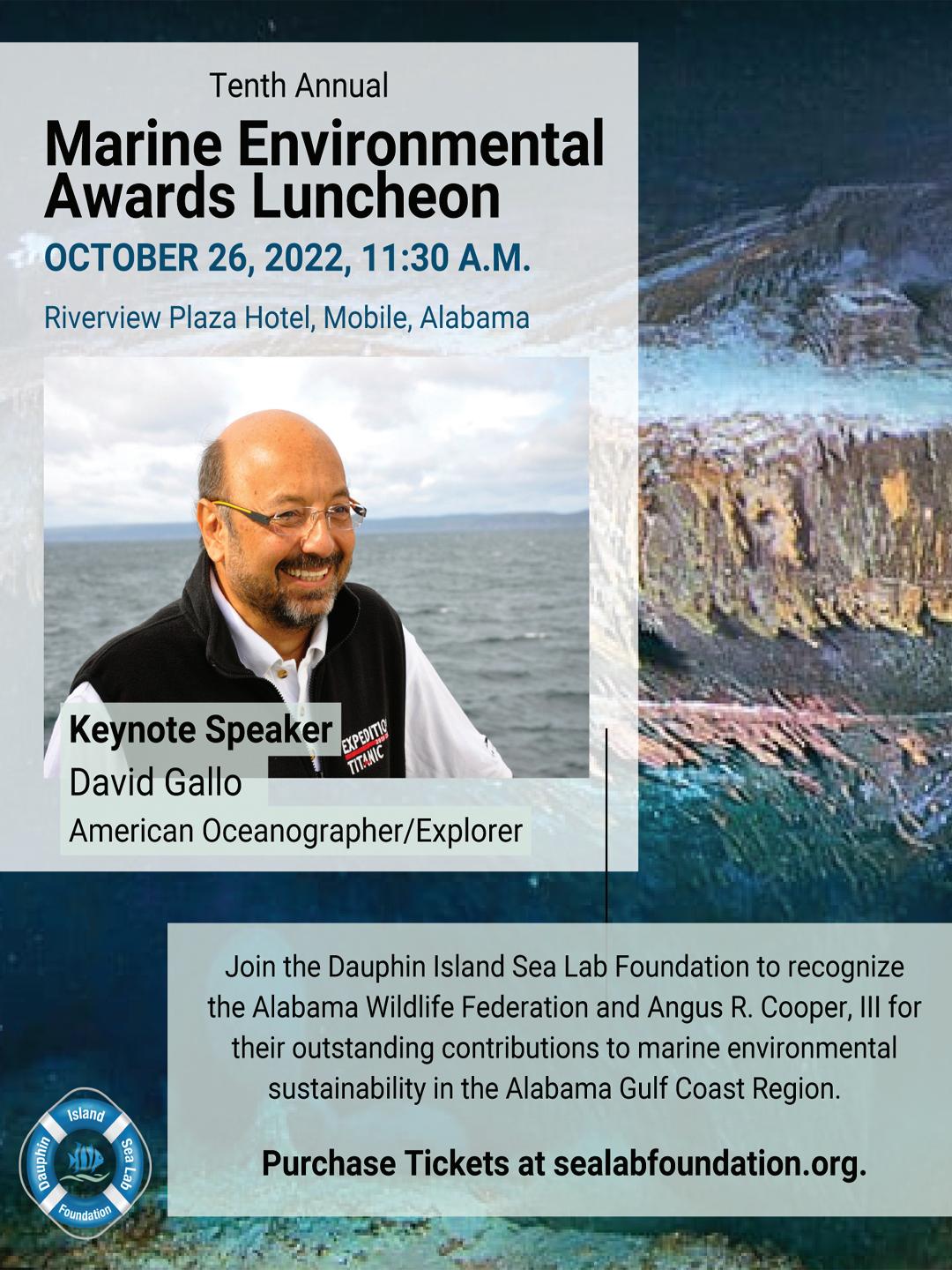 11:30 AM Riverview Plaza, Mobile, AL, 36602 Join the Dauphin Island Sea Lab Foundation to recognize the Alabama Wildlife Federation and Angus R. Cooper, III for their outstanding contributions to marine en vironmental sustainability in the Alabama Gulf Coast Region. Purchase Tickets at sealabfoundation.org. sealabfoundation.org
