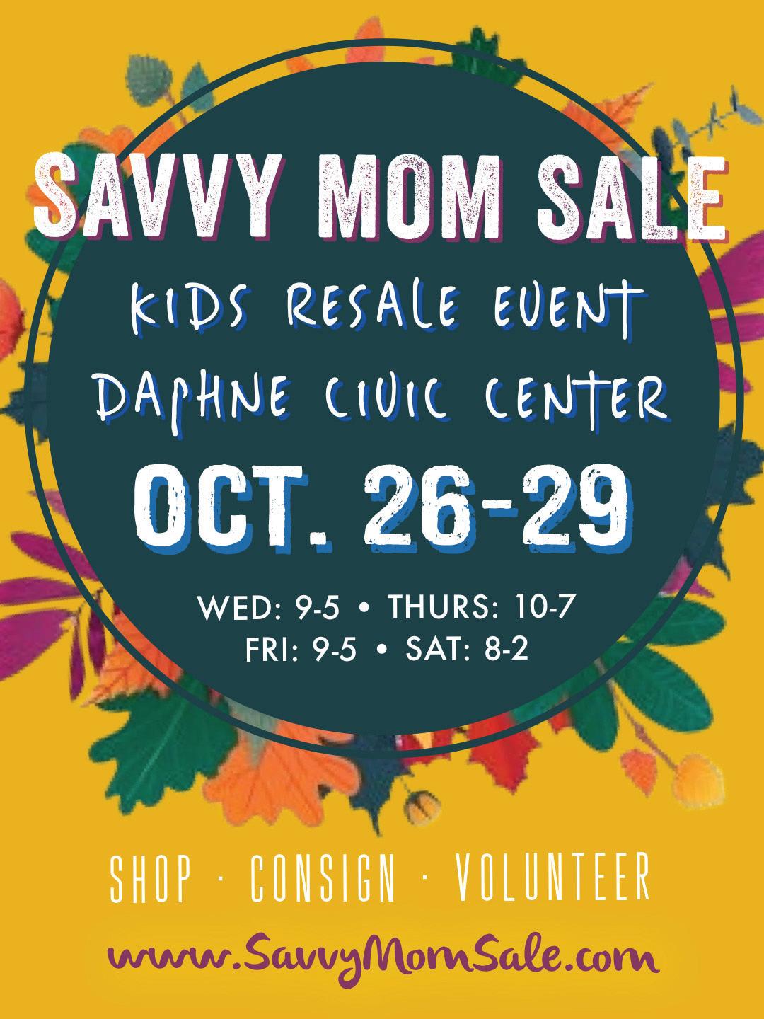 10:00 AM - 7:00 PM, Daphne Civic Center, 2603 US98 Daphne, AL, 36526 Savvy Mom Sale is a seasonal consignment sale. We invite you to volunteer, consign, & shop with the Savvy Mom Sale! Visit our website or checkout our Facebook page for updates, volunteer perks, consignment opportunities and discount days! www.SavvyMomSale.com