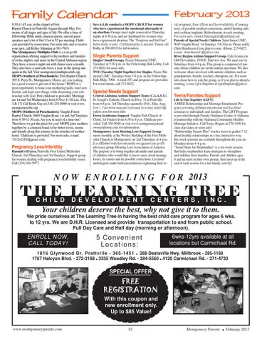 Family Calendar 8:30-11:45 a.m. in the chapel at First Baptist Church in Prattville August through May. For moms of all stages and ages of life. We offer a time of fellowship, Bible study, musical guests, special guest speakers and a lot of fun! Cost is $5 per meeting. Childcare provided by reservation. For more info and to reserve your spot, call Kelley Manning at 361-7919. The Montgomery Multiples Club is a non-profit organization offering support to the mothers and families of twins, triplets, and more in the Central Alabama region. They have a mom’s night out with dinner once a month. They also have a yard sale twice a year, in the spring and again in the fall. Visit montgomerymultiplesclub.org. MOPS (Mothers of Preschoolers), First Baptist Church, 305 S. Perry St., Montgomery. Moms, are you looking for a good excuse to get out of the house? MOPS is a great opportunity to hone your mothering skills, meet new friends, and learn new things while deepening your relationship with God. Free childcare is provided. Meetings are 1st and 3rd Wednesdays from 9:30 to 11:30 a.m. (Oct. 3 & 17) Call Kristi Gay at (334) 233-8989 or visit www. montgomeryfbc.org. MOPS (Mothers of Preschoolers), Vaughn Forest Baptist Church, 8660 Vaughn Road, 1st and 3rd Tuesdays from 9:30-11:30 a.m. Are you in need of a time-out? Then have we got the place for you! MOPS joins mothers together by a common bond, to be better wives, moms and friends along this journey in the trenches of motherhood. Childcare is provided. For more info, e-mail VFCMOPS@gmail.com.