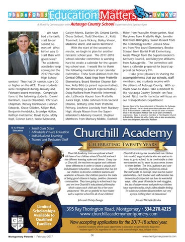 Miller from Prattville Kindergarten, Neal Murphree from Prattville High, Jennifer Reid from Billingsley, Susan Russell from the Technology Center, Jessica Shavers from Pine Level Elementary, Brooke Stinson from Daniel Pratt Elementary, Alesia Waugh from the Superintendent’s Advisory Council, and Marylynn Williams from Autaugaville. The committee will have a calendar prepared for board approval on February 9th. I take great pleasure in sharing the accomplishments that our schools, staff members, and students receive with the citizens of Autauga County. With so much news to share, take a moment to like “Autauga County Schools” on Facebook! Next month my letter will focus on our Transportation Department. Spence Agee is the Superintendent of Education for Autauga County Schools. He is a third generation educator with an ED.S. in Educational Leadership. He has 20 years of experience in the education field as well as 29 years of military experience. Agee is an active member at First Baptist Church in Prattville. He and his wife, Cesily, who is also an educator, have two daughters, Abby and Addison.