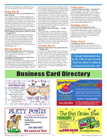Free Jubilee Pops Concert by the Montgomery Symphony Orchestra 7 p.m. Alabama Archives and History Building Lawn. The Montgomery Symphony will kick off the Memorial Day weekend with a free outdoor concert. Come early and bring your friends and family. Picnic baskets, coolers, lawn chairs, and blankets are all welcome at this free concert. In the event of rain, the concert will be held on Saturday night, May 26, at 7 p.m. in the same location. Visit www.montgomerysymphony.org Memorial Day Weekend featuring the Masters Water Ski & Wakeboard Tournament at Callaway Gardens --Through May 28 Kickoff the Memorial Day Weekend by watching the world’s best water skiers and wakeboarders compete for the coveted title of “Masters Champion.” Soak up the sunshine, play in the water and around the beach, and peruse the latest in water sports equipment and techniques. (Tournament is over May 27). For more info, call 1-800-CALLAWAY (225-5292) or visit www. callawaygardens.com.