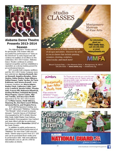 Alabama Dance Theatre Presents 2013-2014 Season The Alabama Dance Theatre opened its spectacular 27th Season with two successful free performances of “Stars on the Riverfront” in early August and will continue its tradition of excellence in the celebratory 2013-2014 Season. Alabama Dance Theatre continues to achieve regional recognition and has established a reputation as a strong training ground for pre-professional dancers. ADT recently held company auditions and the 2013-2014 Senior Company members selected are Aariona Boswell, Amari Boswell, Angelica Burgher, Anna Gentry, Haley Gentry, Hope Gilmore, Safiya Haque, Taylor Jordan, Ke’Yana Robinson, and Jessica Russell. Junior Company members are Aloria Adams, Baylee Clark, Catherine Cobb, Cameron Crawford, Amelia Felder, Phoebe Hall, Francie Hill, Makenzie Kilpatrick, Destiny McGhee, Rebekah Norwood, Maya Pegues, Lauren Taylor, Allyson Trimble, and Ana Clare Wolfe. Apprentices for the 2013-2014 Season are Ta’Myia Cousar, Heidi Gilmore, Hayeong Jin, Derrilynn Leach-Wilson, Ja’mesia Morris, and Virginia Perry. To herald Montgomery’s holiday season, ADT will present “Mistletoe,” featuring “The Messiah” which is back by popular demand. “Favorite Dances of Christmas” choreographed by ADT’s Artistic Director Kitty Seale, Ballet Master Foye DuBose, and Resident Choreographers Sara Sanford and Janie Alford will also be performed. Performances will be November 15-17 at the Davis Theatre. In addition to public performances, ADT offers special school performances of “Mistletoe” for more than 3,000 area students. Tickets range in price from $15- $30 and can be purchased three weeks prior to performance date. Visit www.alabamadancetheatre.com or call 241-2590 for information on tickets.