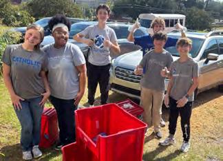 Montgomery Catholic’s 9th graders enjoyed “Freshman Escape Day” on Thursday, October 2. The day began with Mass in the chapel before students headed to Reality and Truth Ministries for a morning of service. The freshmen class rolled up their sleeves to sort clothing, organize the donation intake room, clean bathrooms, and more. At Montgomery Catholic, we believe we are called to serve others and we love weaving service into the heart of education. In the afternoon, the students enjoyed lunch together and celebrated with some well-earned fun at the Montgomery Zoo. Pictured: Montgomery Catholic students Ellie Wallcok, Charlotte Brooks, Hudson Howell, Brady Cox, Evan Crimi, and Liam Skala having fun while serving at Reality and Truth Ministries during Freshmen Escape Day.