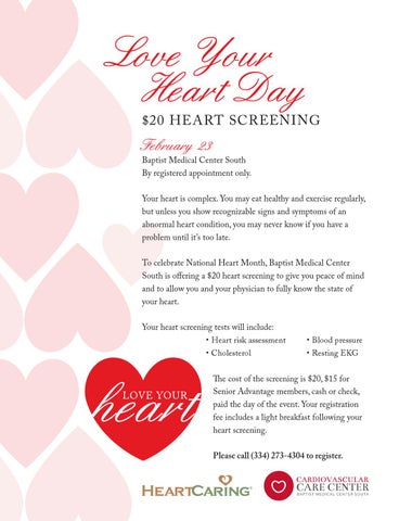 To celebrate National Heart Month, Baptist Medical Center South is offering a $20 heart screening to give you peace of mind and to allow you and your physician to fully know the state of your heart. Your heart screening tests will include: • Heart risk assessment • Cholesterol