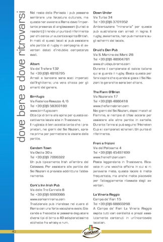 Down Under Via Turba 34 Tel +39 (0)6 3701952 Ambientazione “mineraria” per questo pub australiano con arredi in legno. Il rugby, ovviamente, non può mancare sugli schermi del locale. Druid’s Den Pub Via S. Martino dei Monti 28 Tel +39 (0)6 48904781 www.druidspubrome.com Durante il campionato di calcio italiano qui si guarda il rugby. Basta questo per farvi capire che quando si gioca il Sei Nazioni le gerarchie sono ben chiare. The Flann O’Brien Via Nazionale 17 Tel +39 (0)6 4880418 www.theflannobrien.com Nei giorni del Sei Nazioni, dopo i match al Flaminio, si riempie di tifosi accorsi per assistere alle altre partite in cartello. Durante l’anno si può seguire l’Heineken Cup e i campionati stranieri. Un punto di riferimento. Freni e frizioni Via del Politeama 4 Tel +39 (0)6 45497499 www.freniefrizioni.com Posto leggendario in Trastevere. Ricavato in una vecchia officina in cui si riparavano moto, questo locale è molto frequentato, ma anche molto piacevole per l’atteggiamento rilassato degli avventori. La Vineria Reggio Campo de’ Fiori 15 Tel +39 (0)6 68803268 A Campo de’ Fiori La Vineria Reggio ospita tutti con cordialità e prezzi assolutamente contenuti in un’incantevole location.