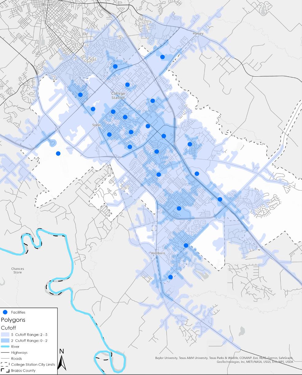 Use the ArcGIS Network Analyst extension to find service areas around any location on a network. Create concentric service areas to evaluate accessibility at various intervals (e.g., 2-minute and 5-minute drive times).