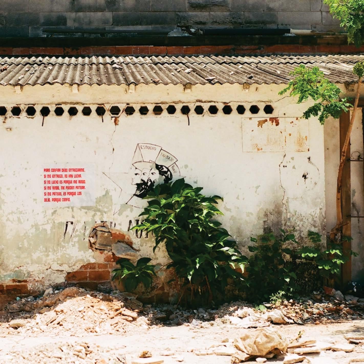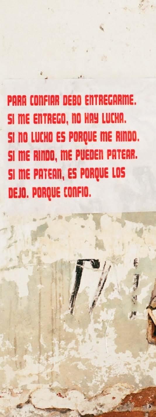Desde Nueva York y mientras preparo el segundo viaje, comienzo a trabajar en el diseño de los textos y en la selección del tipo de letra y el color. Los poemas que quiero rematriar bajo la autoría e intervención urbana de Sana Rabia, deben ser impresos en hojas de papel reciclado, de 24x20 y de 24x23 cada uno. Me los llevo a la Habana impresos y las hojas van dobladas dentro de la maleta que casi no se puede cerrar. Llevo unas cinco impresiones de cada poema. La edición única de «Para confiar debo entregarme» en una impresión de 50x52, viaja conmigo, para en caso de que encuentre, durante los días finales del proceso de repatriación, un busto con el cuál el poema pueda entablar diálogo. Los poemas tienen de título la línea con la que abre cada uno («Para confiar debo entregarme» y «Y en la realidad de aquí, en la realidad de ahora»). Los lugares que selecciono para cada instalación de los poemas tienen un arraigo en mi biografía emocional de la Habana de los años noventa. Una cafetería donde pude esconderme a dormir dos noches, mientras estaba sin casa. Un muro donde aún queda el dibujo de un rotulista anónimo, que calcó a mano los perfiles de Mella, Cienfuegos y Guevara. Cada cabeza coincidiendo con las palabras: estudio, trabajo, fusil.
