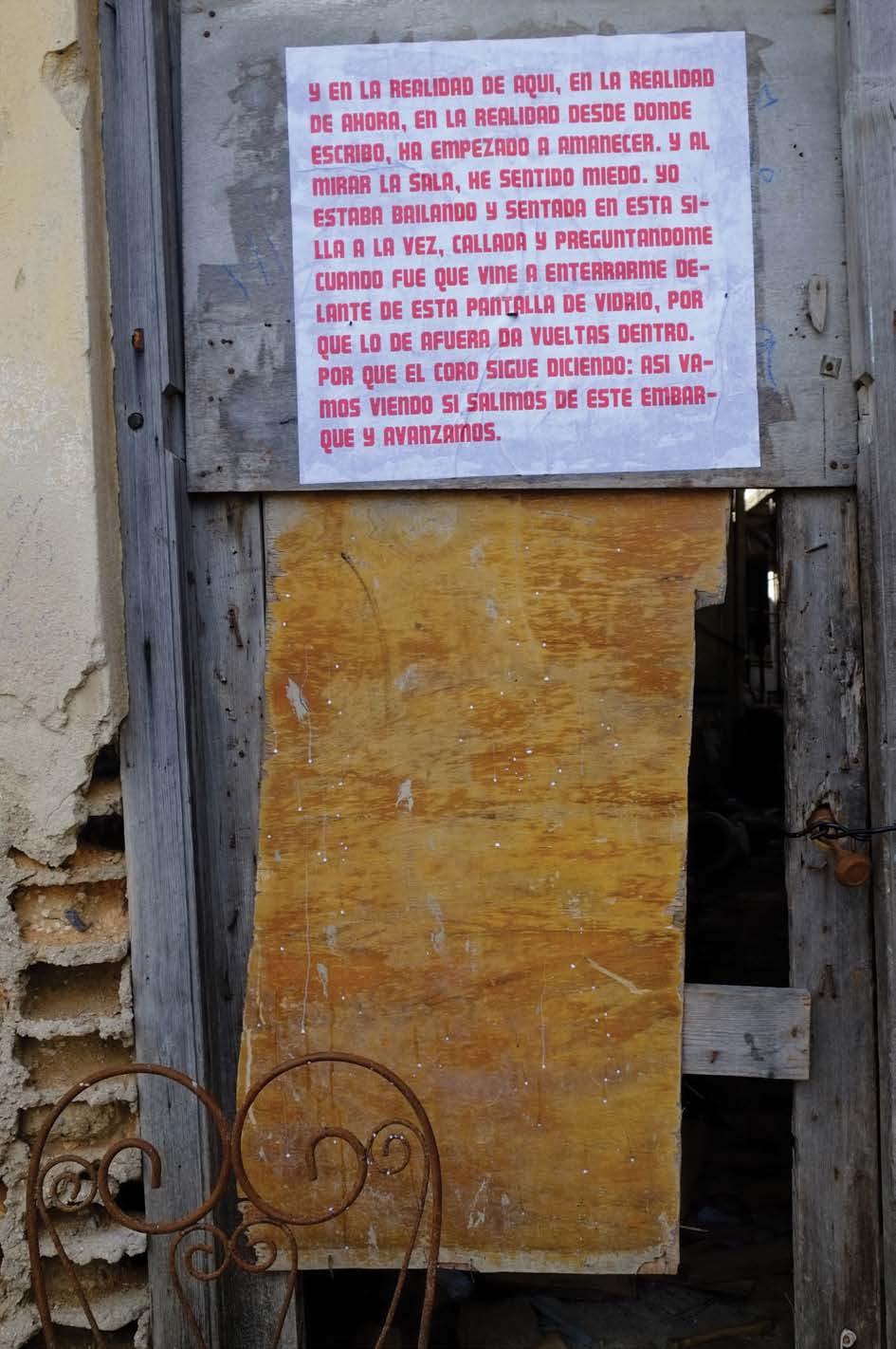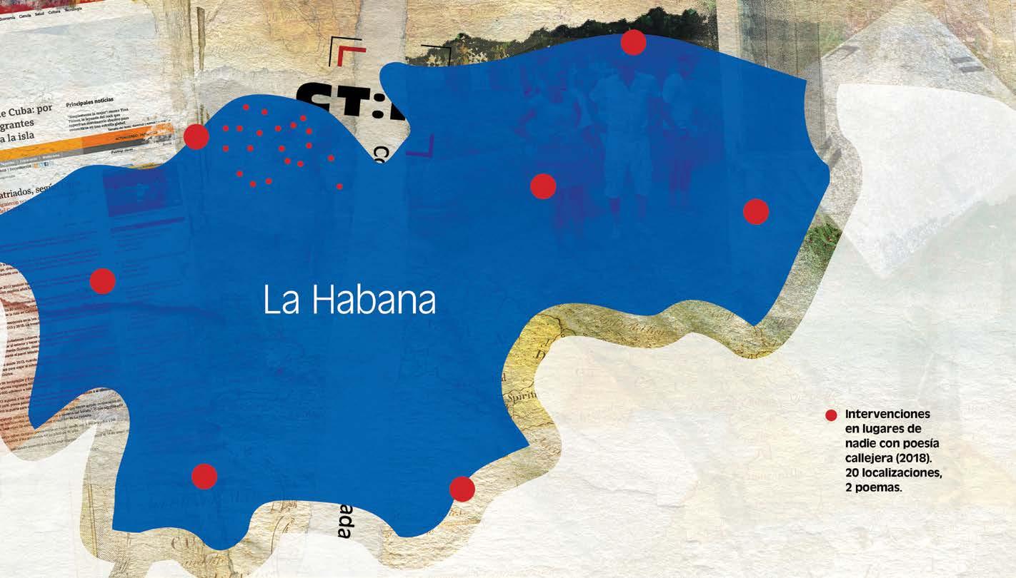 de casi terminado el proceso, todo sigue más o menos igual. Nosotras ya disputamos ese territorio, en algún momento tendré derecho sobre él. Por ahora, me quedo en el apartamento de Tamara en el Vedado. Como no lo puede alquilar, los permisos de cuentapropismo están congelados, me quedo sin tener que pagar. Aquí pueden venirme a visitar dos amigos que me ayudarán con los poemas. Nos levantamos temprano. Metemos en la mochila el pomo con goma muy diluida en agua, el rodillo, la brocha pequeña, el cargador de la batería de la cámara, el cargador del teléfono y un rollo que he hecho de cinco o seis poemas para postear en lugares de nadie. Una canon analógica con un lente de 50 milímetros y unos negativos fujifilms de 200.