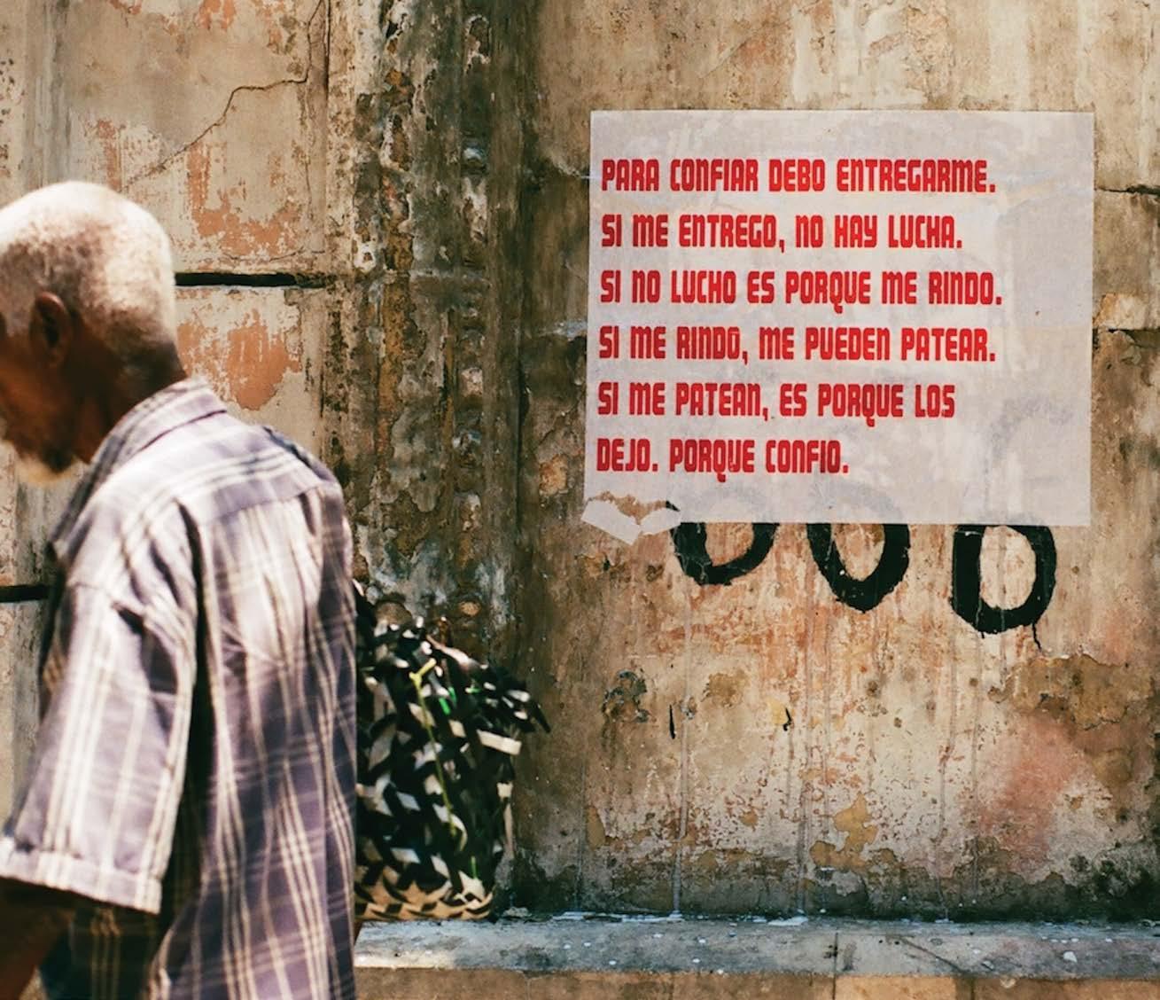 Los dos últimos días del proceso de repatriación durante la segunda visita, mi amiga de tantos años, Caridad, es la que más me ayuda. Es la primera vez que hace videos tan cortos, con un teléfono, en la calle. No tengo que darle instrucciones. Busca sola los mejores encuadres donde no salga mi cara, cruza la calle, se acerca y sale corriendo detrás de mí cuando vemos venir despacio a la policía. En la esquina nos separamos. Por suerte ya teníamos casi todo dentro de la mochila menos la cámara. Tuve tiempo de tomar varias fotos después de pegar una copia del poema «Para confiar debo entregarme», en la fachada de lo que antes era el cine Neptuno, donde trabajé cuando vivía en La Habana. El vecino de enfrente, comenzó por preguntar seguido, desde su balcón, qué decía aquello. El texto dice: Para confiar debo entregarme. Si me entrego, no hay lucha. Si no lucho es porque me rindo. Si me rindo, me pueden patear. Si me patean, es porque los dejo. Porque confío. El vecino desde el balcón grita: Oye, qué está escrito ahí. Cuando le dije que tratara de leerlo y que me dijera él mismo, preguntó nuevamente qué quería decir. Tan sin respuestas se sentía que decidió llamar la policía para que le aclarara la duda. Pasaron unos seis minutos y la patrulla pasó peinando la cuadra. Corrimos sin parar, a pleno sol, hasta el malecón.