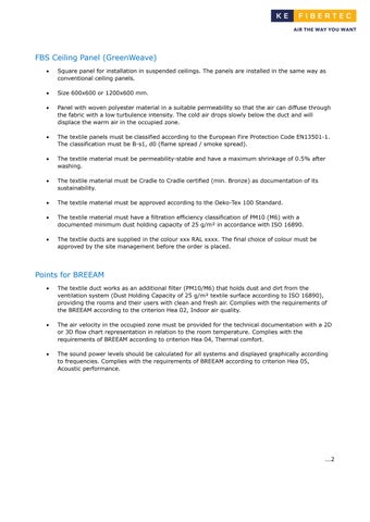 • The textile duct works as an additional filter (PM10/M6) that holds dust and dirt from the ventilation system (Dust Holding Capacity of 25 g/m² textile surface according to ISO 16890), providing the rooms and their users with clean and fresh air. Complies with the requirements of the BREEAM according to the criterion Hea 02, Indoor air quality.