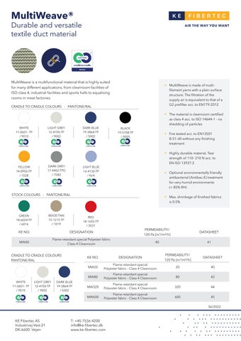 • MultiWeave is made of multifilament yarns with a plain surface structure. The filtration of the supply air is equivalent to that of a G2 prefilter acc. to EN779:2012