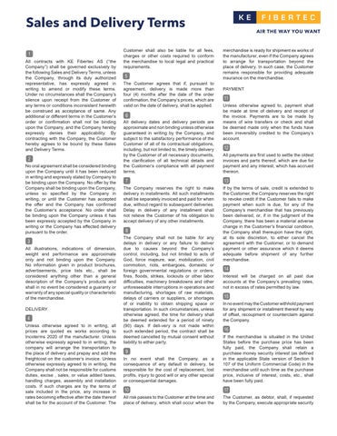 All contracts with KE Fibertec AS (“the Company”) shall be governed exclusively by the following Sales and Delivery Terms, unless the Company, through its duly authorized representative, has expressly agreed in writing to amend or modify these terms. Under no circumstances shall the Company’s silence upon receipt from the Customer of any terms or conditions inconsistent herewith be construed as acceptance of same. Any additional or different terms in the Customer’s order or confirmation shall not be binding upon the Company, and the Company hereby expressly denies their applicability. By contracting with the Company, the Customer hereby agrees to be bound by these Sales and Delivery Terms.