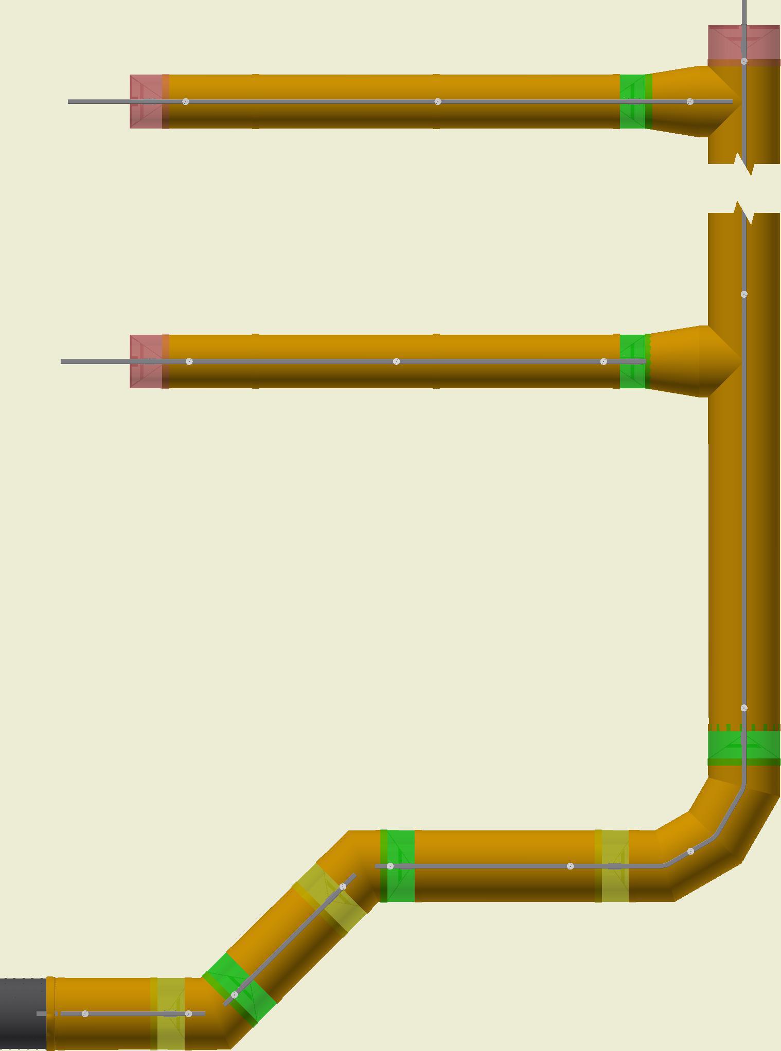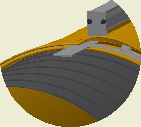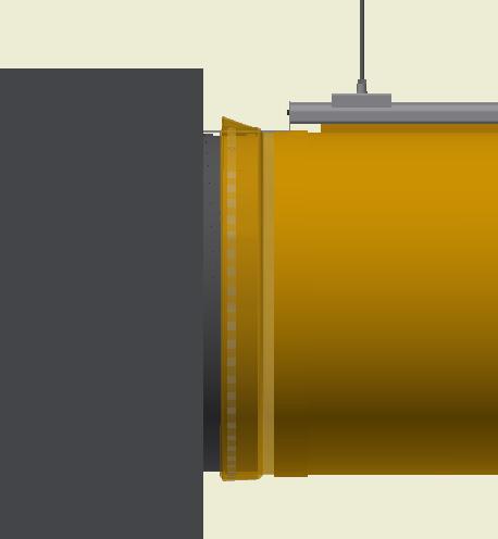 At the end of the duct, lower the SafeStretch Bracket (without the set screw) over the track and into the duct through the 2 slots in the fabric duct section at 12 o'clock, until it "snaps" onto the track. The bracket must be at an angle so one groove sits in place on the rail, and then it can be clicked on. Make sure it is placed so that it is in front of the horizontal strut. Insert the screw, but do not tighten it fully yet, as the bracket still has to be moveable/adjustable.