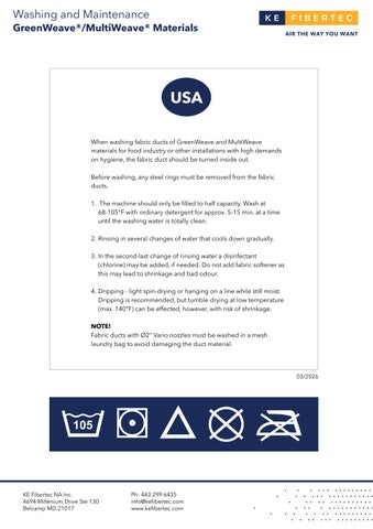 Fabric ducts with Ø2” Vario nozzles must be washed in a mesh laundry bag to avoid damaging the duct material.