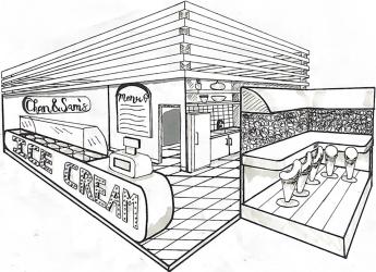 The purpose of this project was to practice drawing in a two-point perspective. This project was drawn using pencil, sharpie markers, and gray Chartpack markers. I used a 30x60 triangle to create the straight lines using the vanishing points on each side of the drawing. This kiosk was conceptualized throughout a long brainstorming process. I used abstract images as inspiration, after determing the type of storefront I was going for. The overal design concept is bright, natural, and playful with a nostalgic, retro look. The neon lights and patterned floors give the retro vibe, while the “ice scream scoop” chairs and greenery backsplash give a natural, playful look. This kiosk caters to customers of all ages.