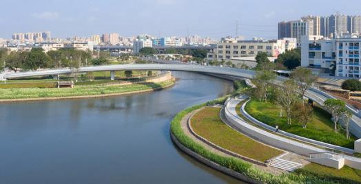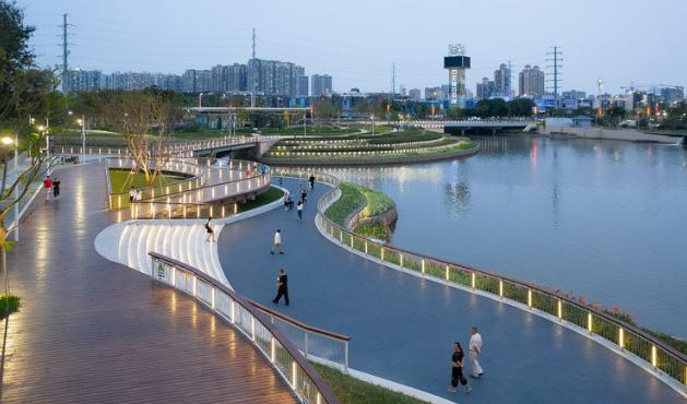 Bentuk desain yang dihasilkan adalah dari pertimbangan dari hubungan antara Jalur pejalan kaki sepanjang 850 meter dengan 4 ruang tepi sungai yang bertabrakan dengan lokasi di area berbeda.