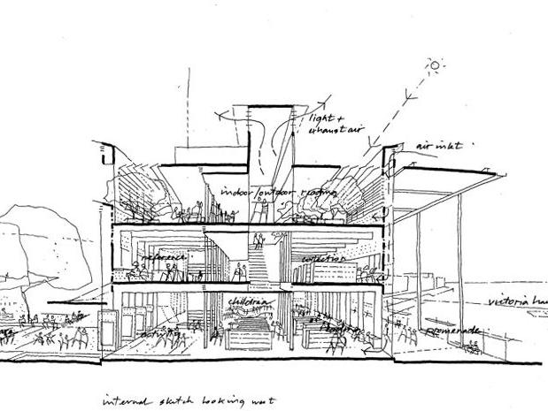 • Perpustakaan memaksimalkan pemandangan dari taman hingga air dan sebaliknya pada 3 tingkat dan bertindak sebagai cerobong ventilasi melalui efek tumpukan (dibangun 8 meter ditepi air)