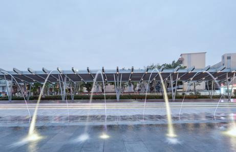• Panel surya seluas 250 m2 terletak di atas tenda. Di siang hari yang terik, hal ini memberikan pola bayangan pada ETFE.