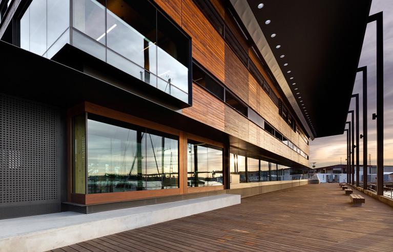 Dirancang diatas dermaga yang struktur bangunannya ingin dipertahankan sebagai warisan budaya sehingga bentuk dari bangunan yaitu 3 lantai yang menggunakan kayu ringan.