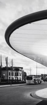 Bentuk shelter yang menyesuaikan konteks dengan mengatur posisi bus mengelilingi sisi luar sehingga dapat menghasilkan ruang terbuka di bagian tengah.