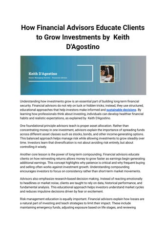 Keith D'Agostino's career in the financial sector stands as a beacon of dedication and excellence, spanning nearly three decades. Embarking on this path at just 21, he has risen to the esteemed position of Senior Managing Director Financial Advisor, a role in which he has demonstrated unparalleled professionalism and expertise. His comprehensive understanding of the industry is underscored by his attainment of critical licenses, including Series 7, 63, and 24, highlighting his depth of knowledge and commitment to regulatory compliance. A graduate of Hofstra University in New York, he earned his BBA degree, showcasing his academic prowess and leadership capabilities. His upbringing in a culturally rich Italian-American family in New York has imbued him with a strong sense of heritage and a broad perspective, profoundly influencing his professional demeanor and personal values. In his professional realm, he is celebrated for his unwavering commitment to ethical practices and his focus on client-centric services. His adept navigation of the complex and dynamic world of finance has earned him respect and trust, not only from his clients but also among his peers. His reputation as a financial advisor is built on a foundation of integrity, expertise, and an unceasing drive for excellence. Outside of his professional life, he is equally committed to his family, embracing the roles of a husband and father with as much passion and dedication as his career. His strong family bonds and nurturing part in his five children's lives reflect his belief in the importance of a well-rounded life. His avid interest in sports, particularly baseball, goes beyond mere enthusiasm, reflected in his long-standing commitment to coaching young athletes. Through this role, he imparts life lessons in discipline, teamwork, and resilience.