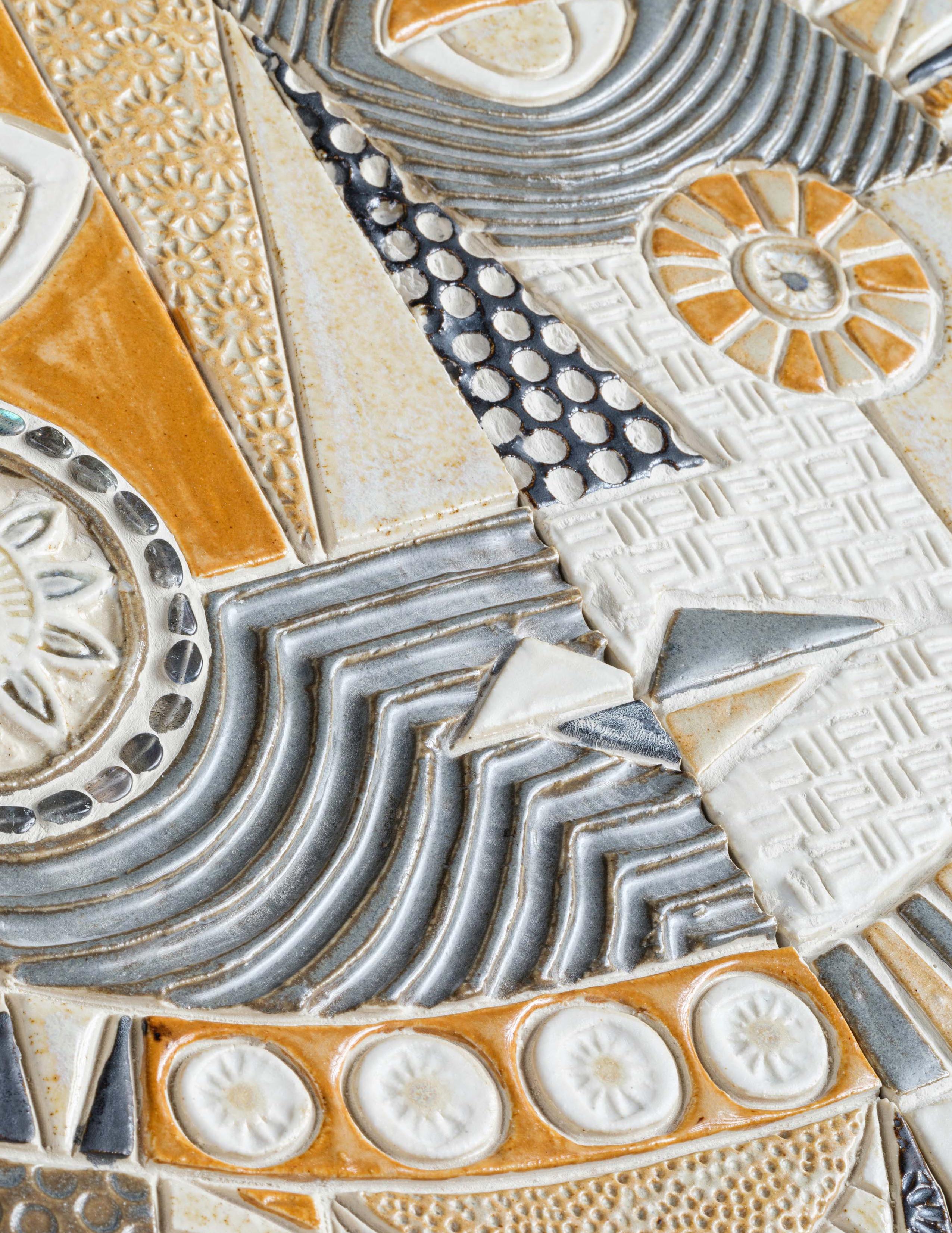 Eachtileisanoriginalartwork,free-handsketchedontoclay,handcarved, individuallyglazed,andproducedinsmallbatchesbythetwoartists.Some designsarefurtherembellishedwithsemipreciousstonesandgroutedfor addeddepthandtexture.