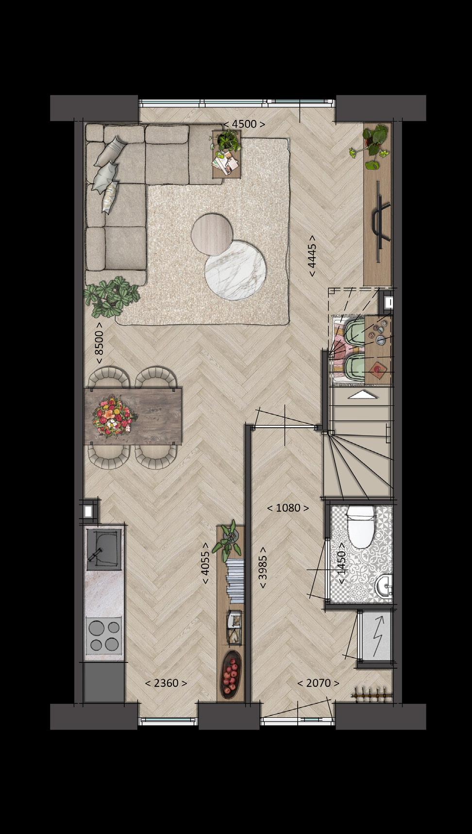 • Woonkamer voor één- of tweepersoonshuishouden en trapkast (optioneel)
