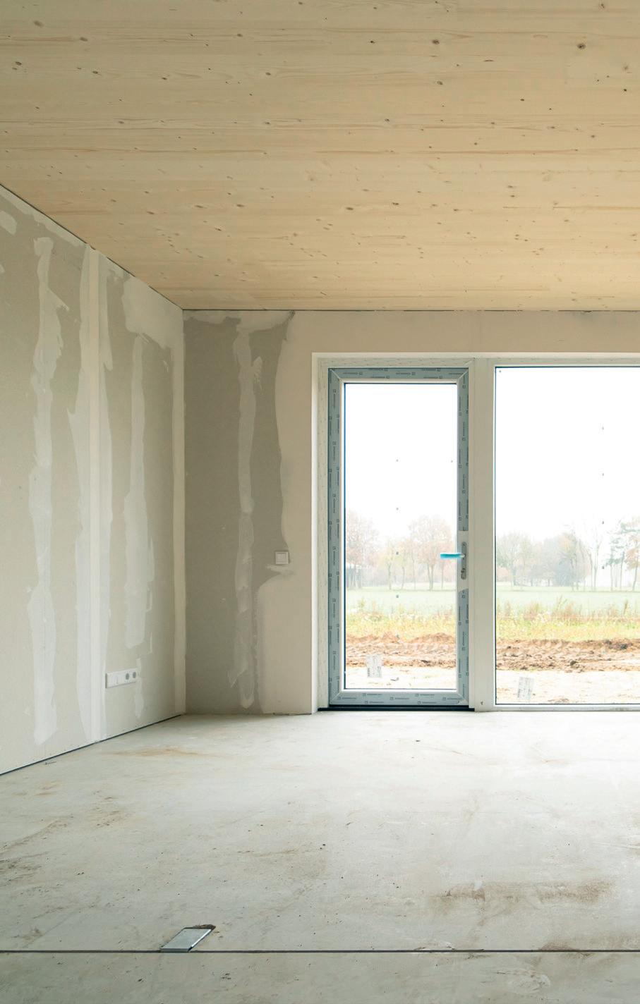 Al het binnen- en buitenhoutwerk (exclusief de CLT verdiepingsvloer) in het zicht wordt fabrieksmatig voorbehandeld met een grondverf/ verduurzaamd. Fabrieksmatig afgelakte radiatoren, binnendeuren, stalen binnendeurkozijnen, buitendeuren, worden in het werk niet behandeld. In het zicht blijvend dakhout, dakplaten en onafgewerkte houten drukbalklaag blijven onbehandeld.