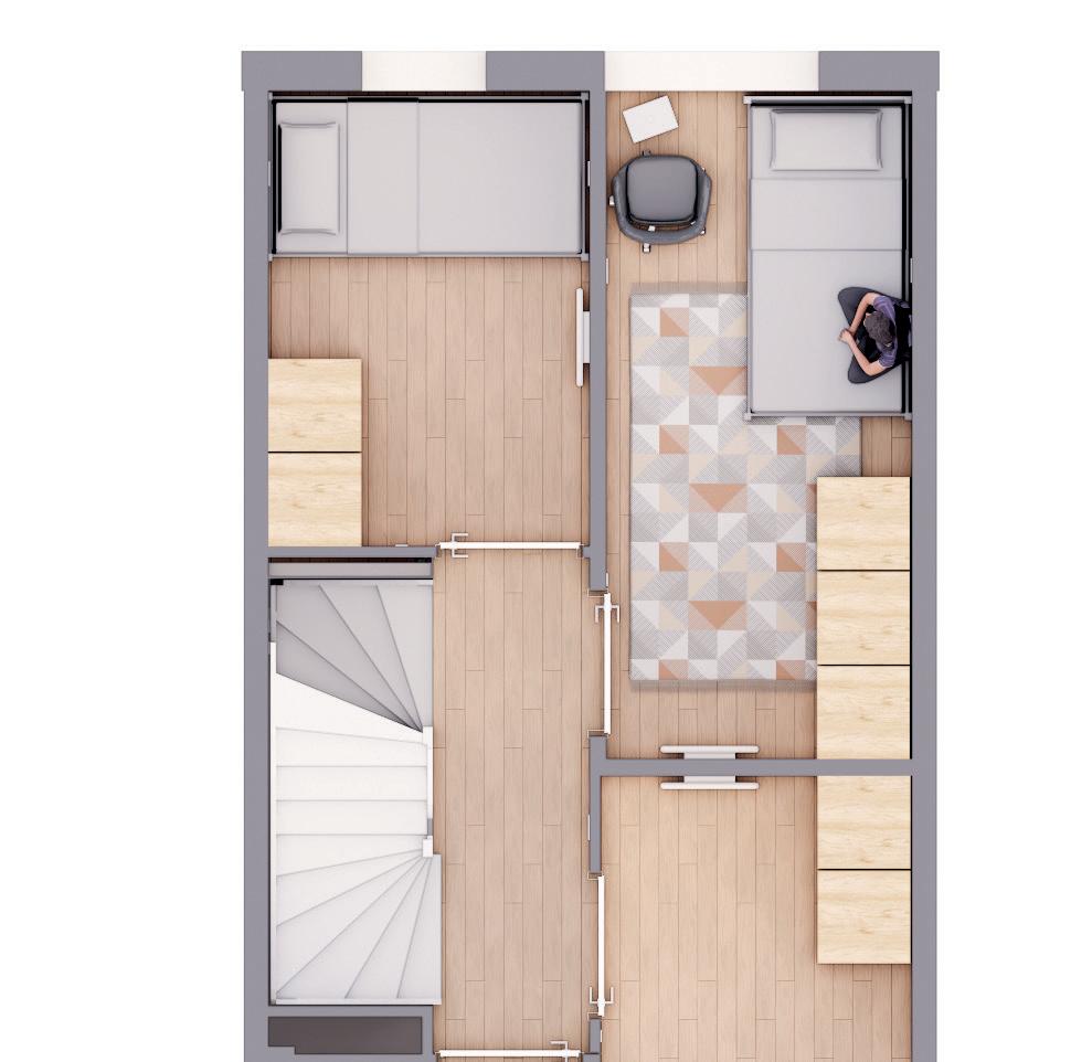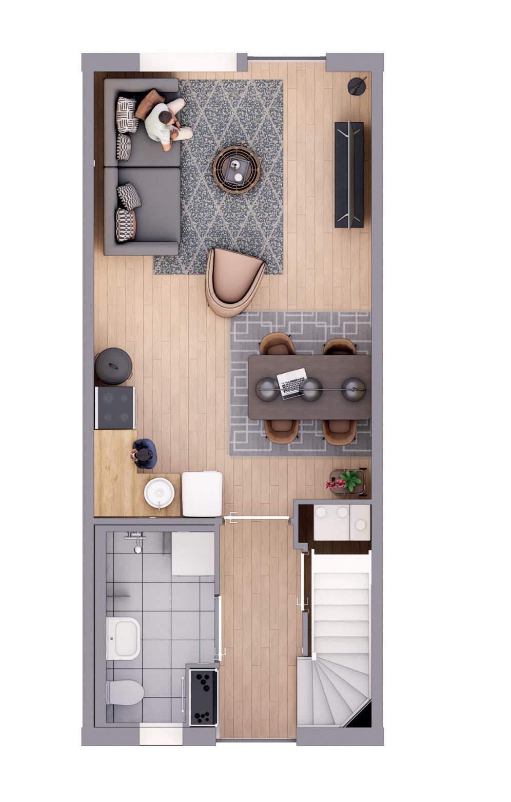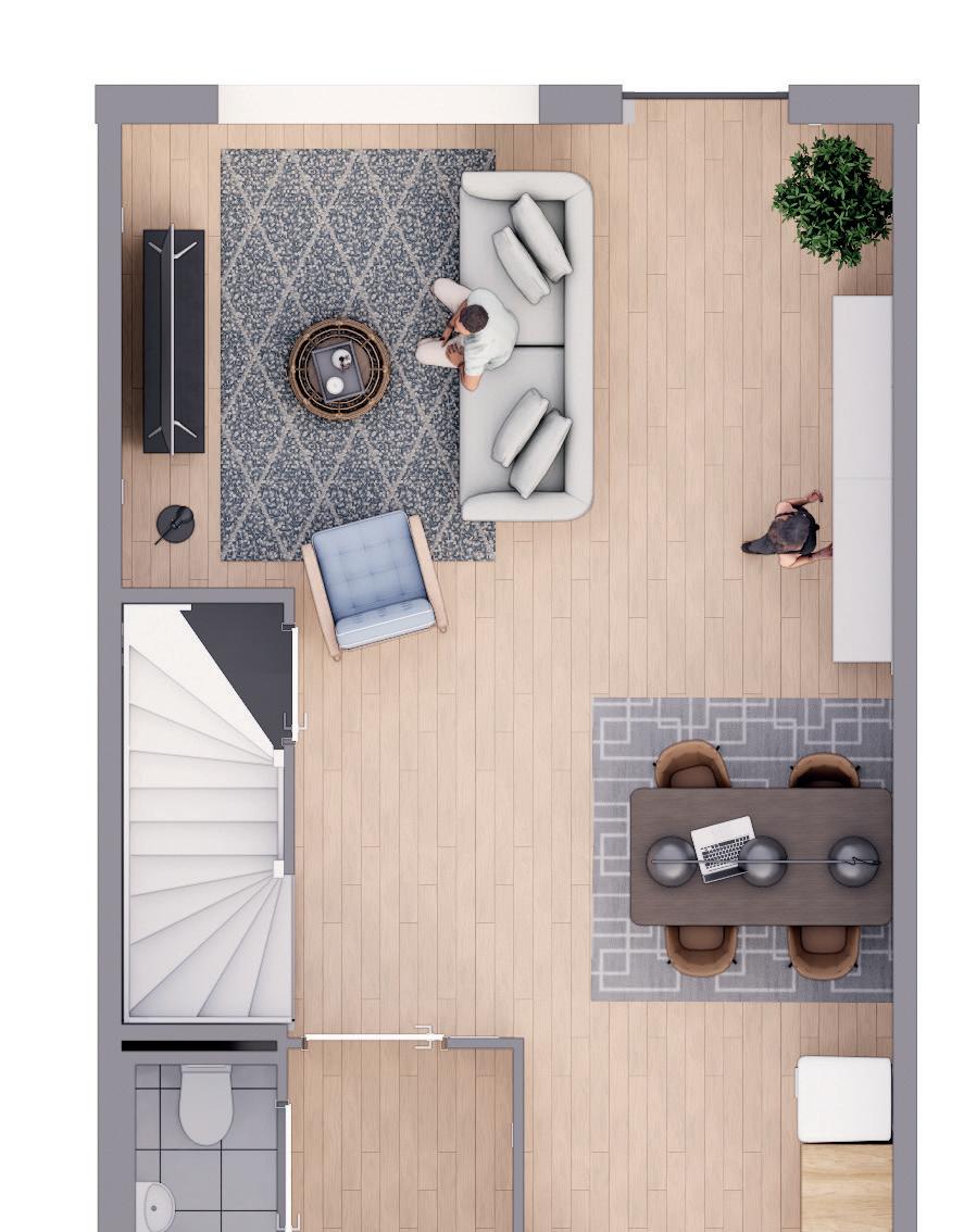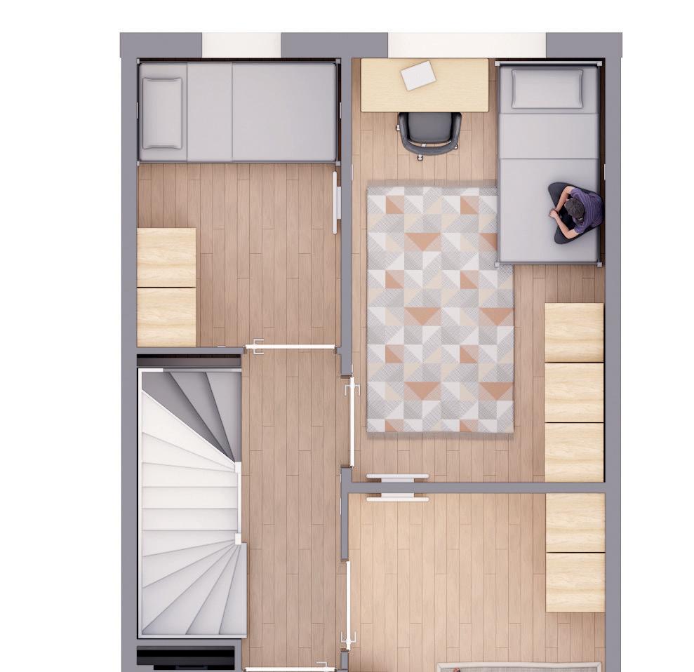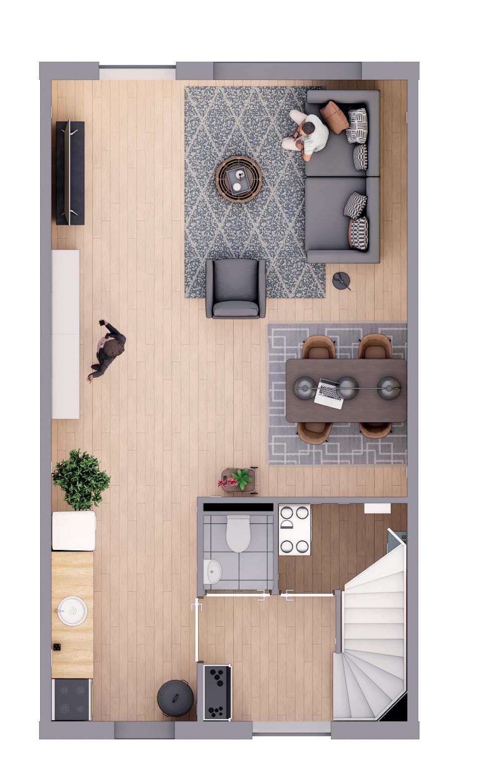 Op de begane grond bevinden zich de woonkamer, keuken, badkamer én slaapkamer. De slaapkamer is aan de achterzijde gesitueerd. Dit zorgt voor een ruimtelijke en lichte doorzon-woonkamer,