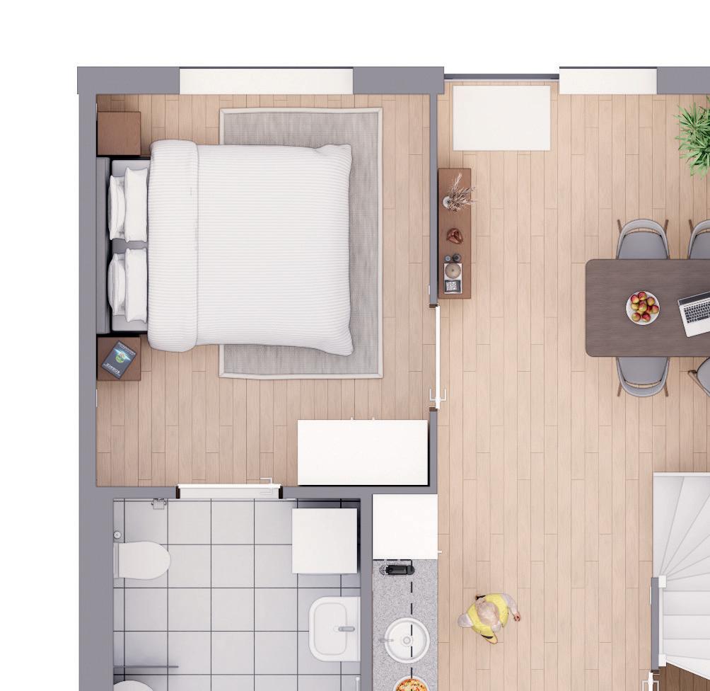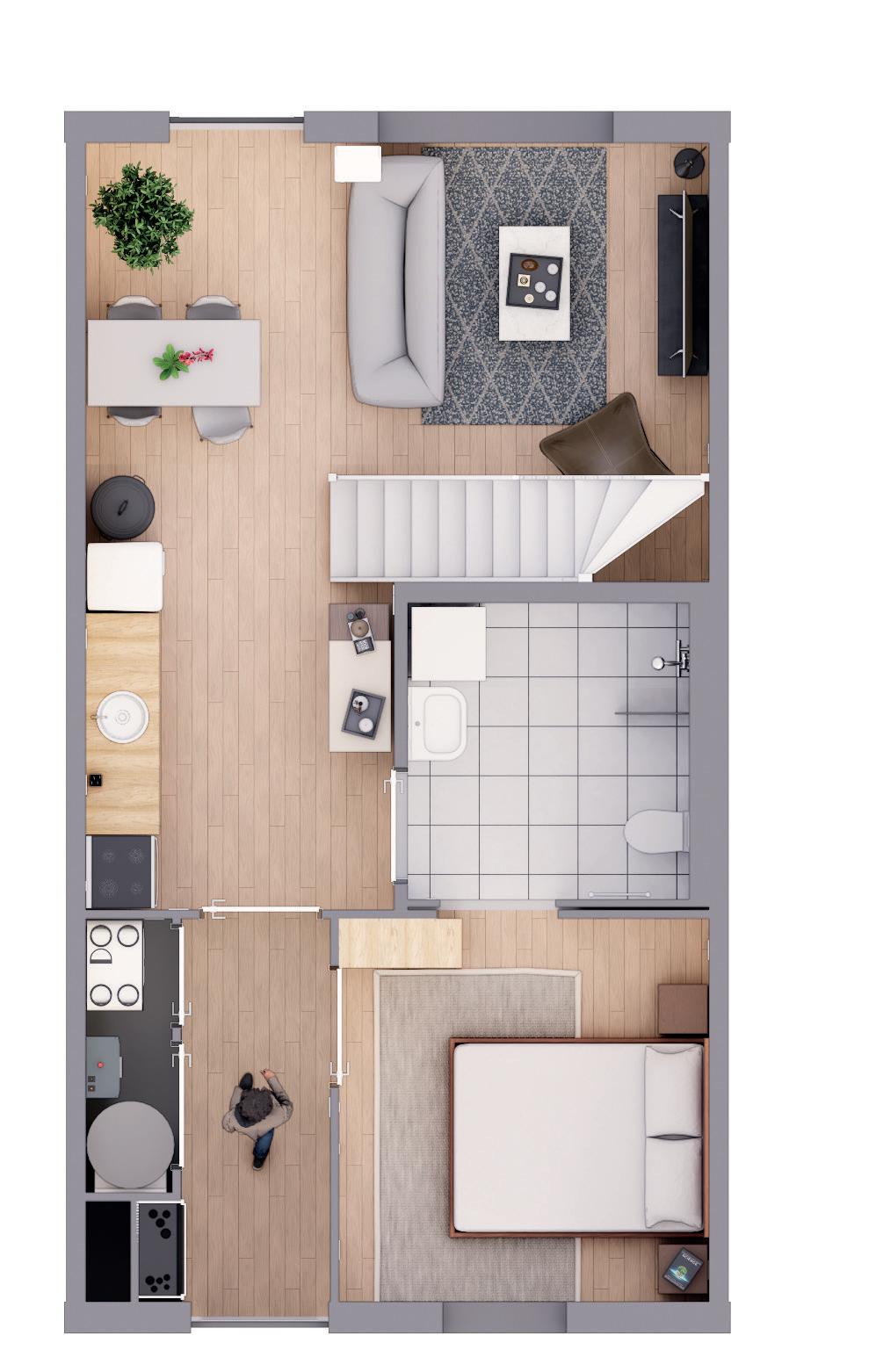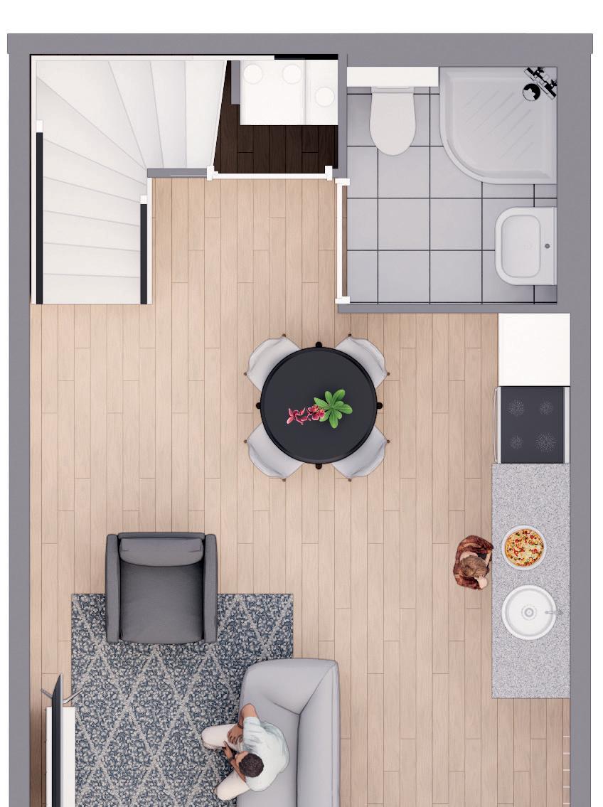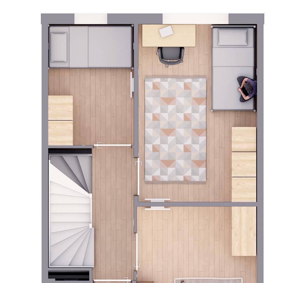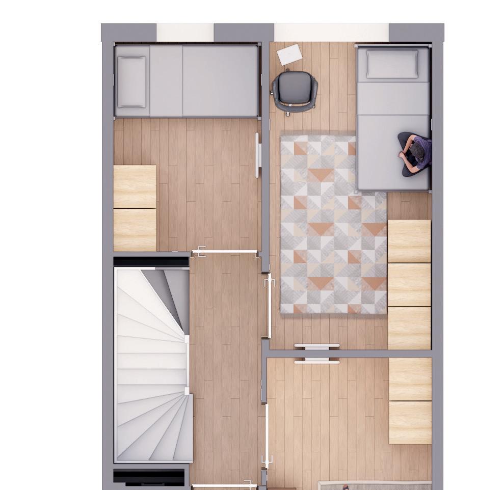Op de begane grond bevinden zich de woonkamer, keuken, badkamer én slaapkamer. De slaapkamer is aan de achterzijde gesitueerd. Dit zorgt voor een ruimtelijke en lichte doorzon-woonkamer,