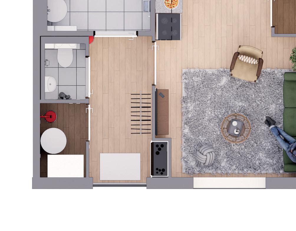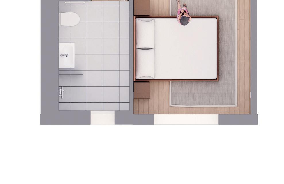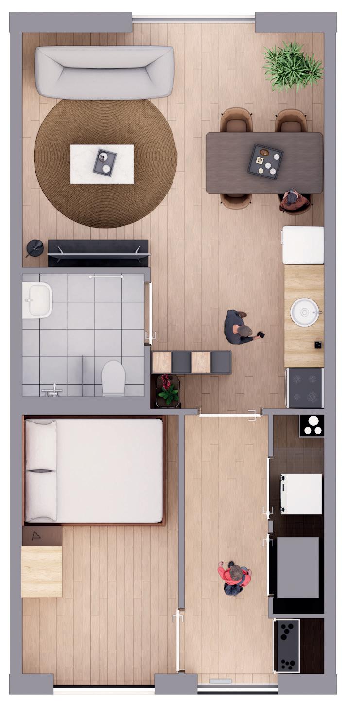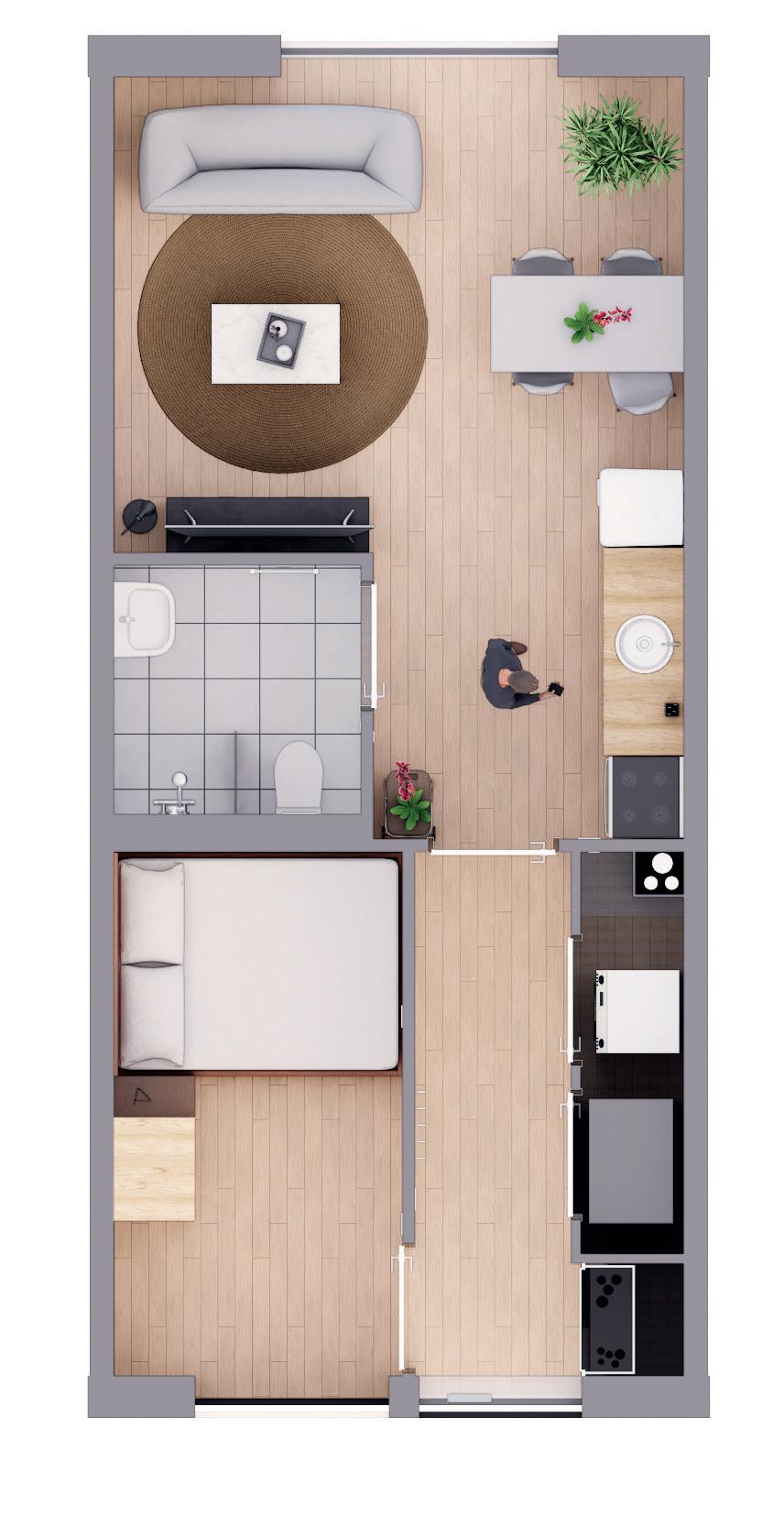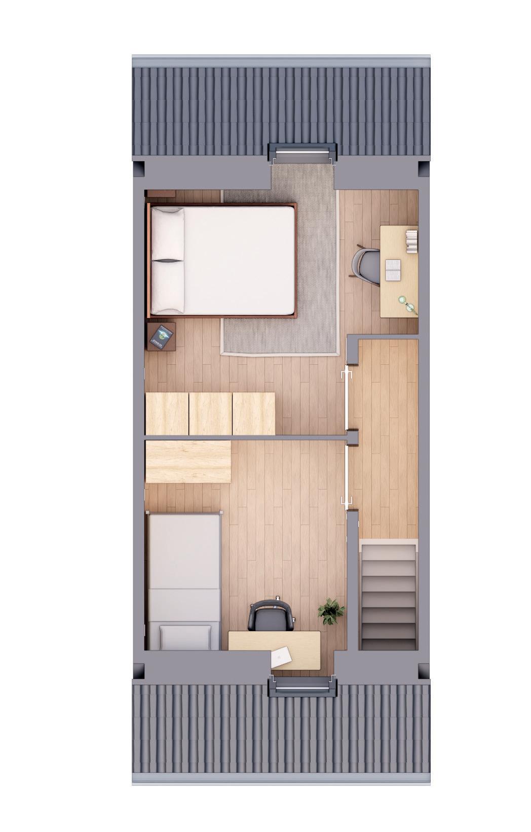 Op de begane grond bevinden zich de woonkamer, keuken, badkamer én slaapkamer. De slaapkamer is aan de achterzijde gesitueerd. Dit zorgt voor een ruimtelijke en lichte doorzon-woonkamer,