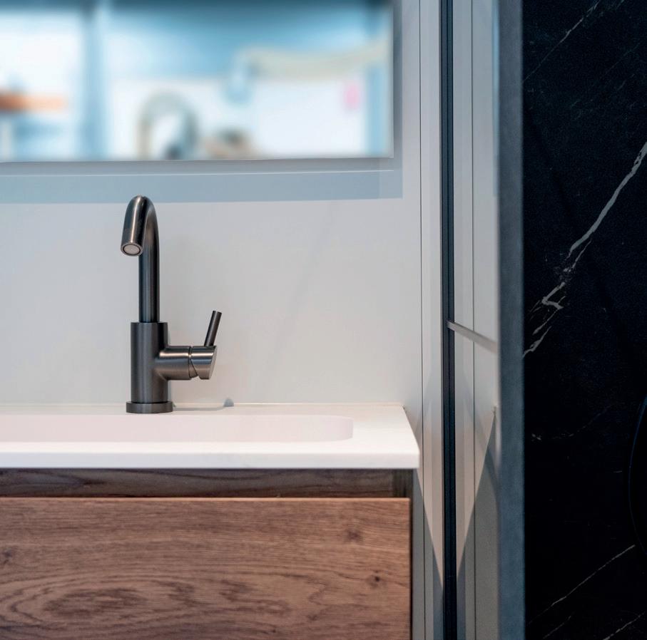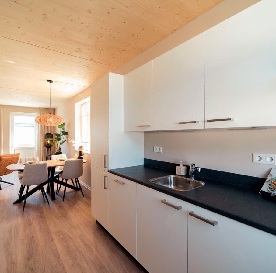 Sylopen keuken, kun je met een gerust hart bezoek uitnodigen. Aan de voorzijde van de woning vind je toilet en douche in één gezamenlijke ruimte, waar ook plaats is voor een wasmachine. De installatietechniek is slim gepositioneerd onder de trap.