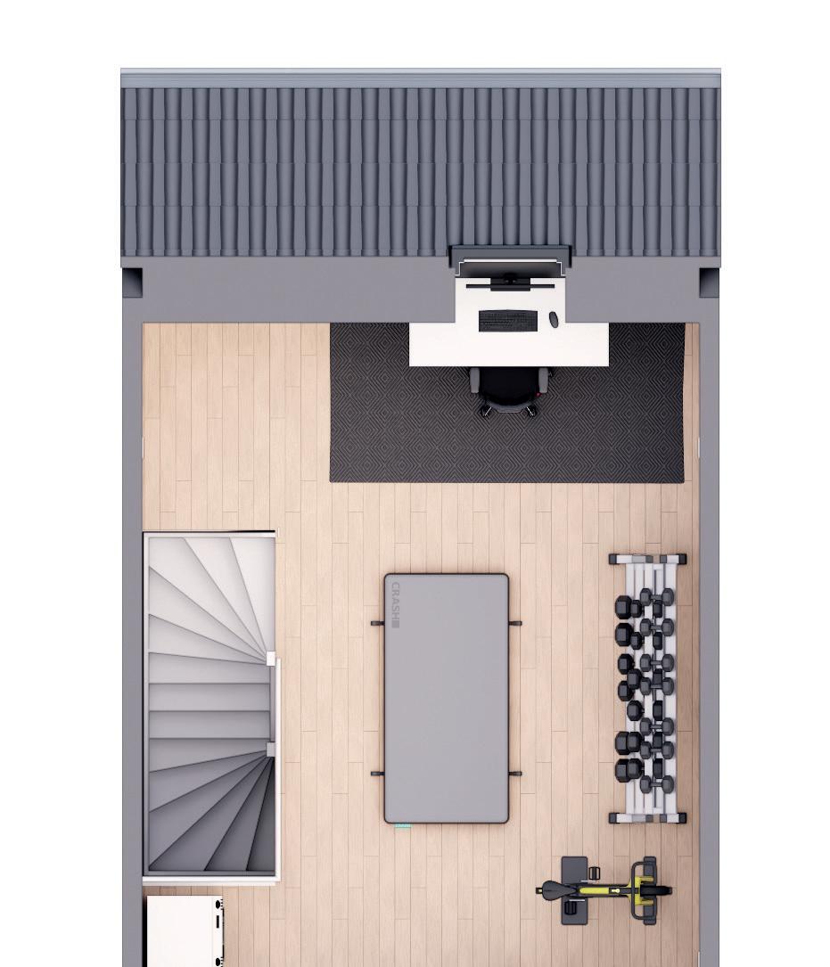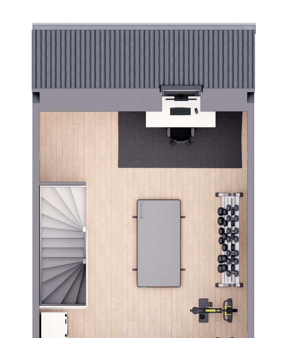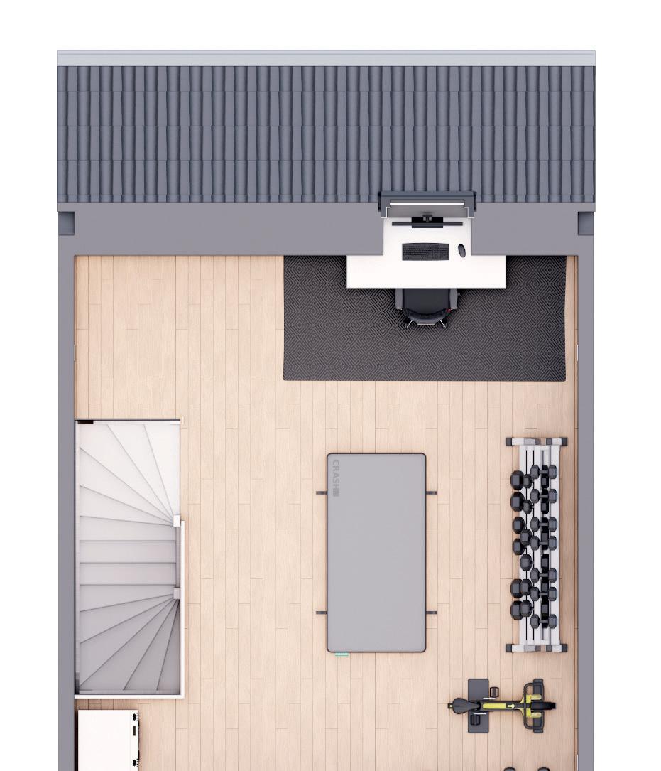 De verdiepingsvloer is een onafgewerkte massieve houtenvloer (CLT vloer), opgedeeld in segmenten. Deze vloer is alleen geschikt voor losliggende vloerbedekking, laminaat of parket. Geadviseerd wordt om een ondervloer toe te passen.